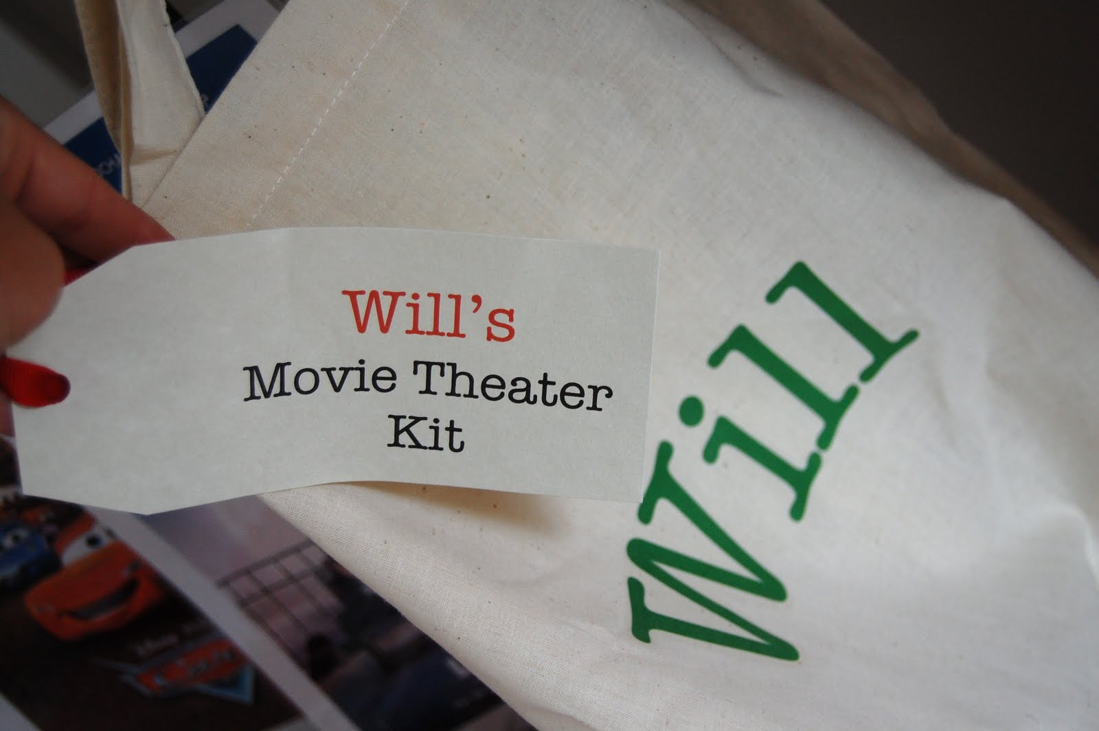 In the bag were also some cardboard popcorn holders bought in the party section at Hobby Lobby. I purchased a roll of tickets at Target and some microwave popcorn. I had some nametag holders leftover from my teaching days. I printed off paper that said "my name is" and included one for the receipient of the gift as well as any siblings.