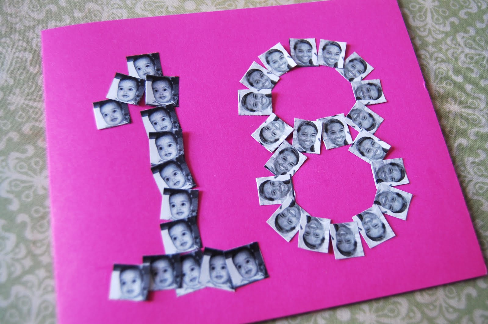 I then cut out each tiny pic and glued them onto a folded piece of cardstock in my niece's favorite color in the shape of #18.